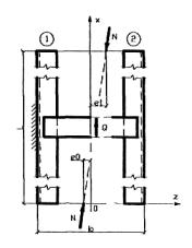 e0 и е1- эксцентриситеты приложения встречных сил на концах сквозного стержня, на рисунке 7.2 эксцентриситеты показаны положительными; N - сжимающие силы, действующие по одной линии; Q - перерезывающая сила, приложенная к среднему сечению планки;