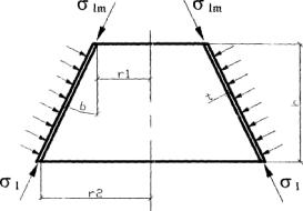 Рисунок 7.4 - Схема конической оболочки вращения 7.5.2.4 Коническая оболочка, нагруженная равномерным внешним давлением р (рисунок 7.4): условное кольцевое расчётное напряжение следует определять по формуле: