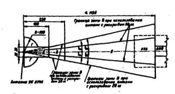 Рис. 2.3. Зоны курсового радиомаяка СП-75, СП-80Н, СП-80М (Измененная редакция, Изм. № 2). Примечания: 1. Зона Г предусматривается для КРМ СП-80М при установке по II и III категориям, а также для КРМ СП-76 и КРМ СП-80 Н с рабочим сектором ±35° при установке по II категории. 2. Размеры зон не зависят от высоты антенны КРМ
