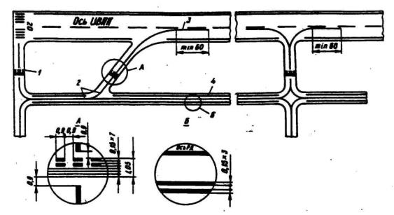 Рис. 3.6. Схема маркировки РД: 3.1.11. Маркировку осевой линии РД на прямолинейных и криволинейных участках и пересечениях РД выполняют сплошной линией шириной 0,15 м. Осевая линия РД в местах пересечения с маркировкой места ожидания ВС прерывается. 3.1.12. Маркировка осевой линии РД на участке сопряжения с ИВПП производится продолжением параллельно маркировке осевой линии ИВПП на расстоянии не менее 60,0 м от точки их касания. РД, примыкающие к торцам ИВПП, маркируются в соответствии с рис. 3.6. 3.1.13. Маркировка мест ожидания ВС на РД перед выруливанием на ИВПП выполняется четырьмя желтыми (оранжевыми) поперечными линиями: двумя сплошными и двумя пунктирными на расстоянии от оси ИВПП согласно табл. 3.3. Таблица 3.3