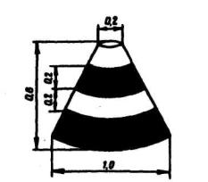 Рис. 3.13. Знак центра полосы: 3.2.5. Пограничные знаки (рис. 3.14) определяют границы ГВПП, РД, МС и перрона и представляют собой конус высотой 0,8 м, диаметр нижнего основания 1,0 м, верхнего - 0,2 м. Поверхность пограничного знака окрашивается чередующимися поперечными полосами красного и белого цветов или черного и белого цветов шириной 0,2 м. Нижняя полоса окрашивается в темный цвет.