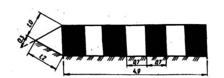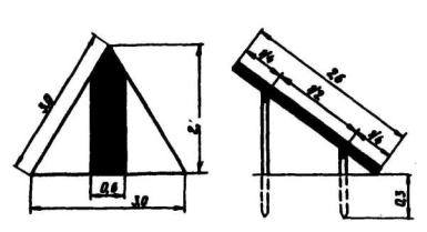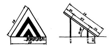 Рис. 3.16. Угловой знак: 3.2.16. Входной знак (рис. 3.17) имеет фирну трехгранной призмы длиной 4,9 м и высотой 1,0 м. В сечении знак имеет форму равнобедренного треугольника с основанием 1,2 м. Входные знаки устанавливают на линии начала ГВПП на расстоянии 5,0 м от ее боковых границ. Лицевую сторону знака окрашивают чередующимися по цвету вертикальными полосами белого и черного цветов. Противоположная сторона входного знака, обозначающая конец ГВПП, окрашивается полосами с чередованием белого и красного (оранжевого) цветов. Крайние полосы должны иметь темный цвет. 3.2.17. Знаки боковых границ (рис. 3.18) выполняют в виде щитов, имеющих размер 1,2´1,2 м, и устанавливают в 1,0 м от внешней боковой границы ГВПП, на расстоянии 100 м друг от друга и от конца ГВПП на аэродромах класса В и Г и 80 м - на аэродромах класса Д. (Измененная редакция, Изм. № 2). Они устанавливаются на стойках так, чтобы высота знака от поверхности расчетного слоя снега до верха грани щита составляла 1,4 м. Поверхность щитов со стороны посадки окрашивают в красный (оранжевый) цвет с полосой по диагонали белого цвета. Противоположная сторона знака окрашивается в красный цвет. 3.2.18. Осевые знаки имеют форму равностороннего треугольника со стороной 3,0 м. Они выполняются из уплотненного щебня (гравия) толщиной 0,1 - 0,12 м, уложенного на песчаное основание. (Измененная редакция, Изм. № 2). Знаки устанавливают заподлицо с поверхностью грунта на расстоянии 200 и 400 м от конца ГВПП и окрашивают в белый цвет. 3.2.19. Осевой знак между ЛП и БПРМ (рис. 3.19) обозначает направление оси ГВПП и выполняется в виде равностороннего треугольника со стороной 3,0 м. Знаки устанавливают на расстоянии 600 и 800 м от конца ГВПП и окрашивают чередующимися полосами красного (оранжевого) и черного цветов. Крайние полосы знака окрашивают в красный (оранжевый) цвет. 3.2.20. В тех случаях, когда БПРМ расположена на расстоянии более 1000 м от торца ГВПП, устанавливают три знака на одинаковом расстоянии друг от друга. При отсутствии БПРМ на ее месте устанавливают дополнительный треугольный знак. Первый знак от начала ГВПП устанавливают под углом к горизонтали 15°, второй - 30° и третий - 45°. Крыша здания БПРМ маркируется чередующимися полосами или шахматными клетками шириной 0,5 м, окрашенными в черный и красный (оранжевый) цвета. 3.2.21. Знаки подхода (рис. 3.20) имеют форму равностороннего треугольника со стороной 3,0 м и устанавливают по линии продолжения оси ГВПП на расстоянии от ее конца 1200, 1400, 1600, 1800 и 2000 ми на высоте 1,0 м от поверхности земли с наклоном по направлению посадки под углом 40°. Поверхность знака окрашивают на летний период в белый, а на зимний - в черный цвет с полосой посередине шириной 0,6 м, окрашенной в красный (оранжевый) цвет.