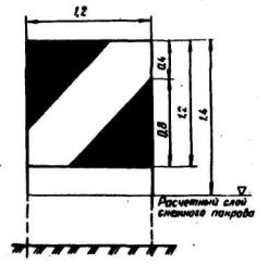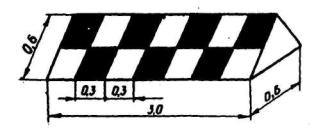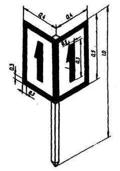 Рис. 3.25. Знак-ориентир: 3.3.6. Маркировку объектов и сооружений должны выполнять предприятия, а также организации, которые их строят или эксплуатируют. 3.3.7. Необходимость и характер маркировки и светоограждения проектируемых зданий и сооружений определяются в каждом конкретном случае соответствующими органами гражданской авиации при согласовании строительства. 3.3.8. Радиотехнические объекты, расположенные на приаэродромной территории, подлежат специальной маркировке и светоограждению по требованию ДВТ и МО РФ. 3.3.9. Препятствия, особо опасные для полетов ВС, независимо от места их расположения, должны иметь средства радиомаркировки, состав и тактико-технические данные которых в каждом отдельном случае должны согласовываться с ДВТ и МО РФ. 3.3.10. Дневной маркировке не подлежат объекты, которые затенены более высокими маркированными объектами. Примечание. Затененным препятствием является любой объект или сооружение, высота которого не превышает высоты, ограниченной двумя плоскостями: горизонтальной, проведенной через вершину маркированного объекта в направлении от ВПП; наклонной, проведенной через вершину маркированного объекта и имеющей нисходящий уклон 10 % в направлении к ВПП. 3.3.11. Дневная маркировка должна отчетливо выделяться на фоне местности, быть видна со всех направлений и иметь два резко отличающихся друг от друга маркировочных цвета: красный (оранжевый) и белый. 3.3.12. Объекты, которые по своему функциональному назначению должны находиться вблизи ЛП и на территории ПВП, предназначенные для обслуживания полетов (объекты УВД, БПРМ, ДПРМ, ГРМ, КРМ и др., исключая КДП): а) проекция которых на любую вертикальную плоскость имеет ширину и высоту менее 1,5 м, должны окрашиваться в один хорошо заметный цвет (оранжевый или красный) в соответствии с рис. 3.26, а; б) имеющие сплошные поверхности, проекция которых на любую вертикальную плоскость составляет или превышает 4,5 м и обоих измерениях, должны маркироваться квадратами со стороной 1,5 - 3,0 м в виде шахматной доски, причем углы должны окрашиваться в более темный цвет (рис. 3.26, б); в) имеющие сплошные поверхности, одна сторона которых в горизонтальном или вертикальном измерении превышает 1,5 м, а другая сторона в горизонтальном или вертикальном измерении составляет менее 4,5 м, должны окрашиваться чередующимися по цвету полосами шириной 1,5 - 3,0 м. Полосы наносят перпендикулярно большему измерению и крайние окрашивают в темный цвет (рис. 3.26, в). 3.3.13. На приаэродромной территории аэропортов и воздушных трассах РФ и МВЛ сооружения высотой до 100 м маркируют от верхней точки на 1/3 высоты горизонтальными чередующимися по цвету полосами шириной 0,5 - 6,0 м (рис. 3.26, г). Число чередующихся по цвету полос должно быть не менее трех, причем крайние полосы окрашивают в темный цвет. На приаэродромной территории международных аэропортов и воздушных трассах международного значения эти объекты маркируются горизонтальными чередующимися по цвету полосами той же ширины сверху до основания (рис. 3.26, д). 3.3.14. Сооружения высотой более 100 м, а также расположенные в аэропортах сооружения каркасно-решетчатого типа ( независимо от их высоты) маркируются от верха до основания чередующимися полосами шириной, принимаемой в соответствии с табл. 3.6, но не более 30 м. Полосы наносят перпендикулярно большему измерению, крайн