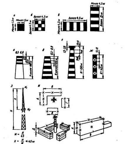 Примечание. Полосы должны быть равны по ширине; ширина отдельных полос может отличаться от ширины основных полос до ±20 % 3.3.15. Световое ограждение должно быть предусмотрено на всех препятствиях, указанных в пп. 3.3.2 - 3.3.14, с целью обеспечения безопасности при ночных полетах и полетах при плохой видимости. 3.3.16. Для светового ограждения должны быть использованы заградительные огни. На особо опасных препятствиях устанавливаются высокоинтенсивные огни. 3.3.17. Препятствия должны иметь световое ограждение на самой верхней части (точке) и ниже через каждые 45 м. Расстояния между промежуточными ярусами, как правило, должны быть одинаковыми. На дымовых трубах верхние огни размешаются ниже обреза трубы на 1,5 - 3,0 м. Схемы маркировки и светоограждения приведены на рис. 3.26, з, и. Количество и расположение заградительных огней на каждом ярусе должно быть таким, чтобы с любого направления полета (под любым углом азимута) было видно не менее двух заградительных огней.