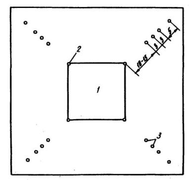 3.4.11. Швартовочные площадки (ШП) маркируют Т-образным знаком и буквой Ш вместо цифры, обозначающей номер МС. Буква Ш должна иметь размеры 1´1 м и ширину линий 0,1 м. 3.4.12. Вертодромы и посадочные площадки оборудуются ветроуказателем (см. п. 3.2.24), который располагается вблизи зоны конечного захода на посадку и взлета. 3.4.13. На вертодромах (посадочных площадках) в зимний период, а также расположенных на пыльных и песчаных грунтах рабочая площадь обозначается дополнительными знаками в виде конусов и щитов-ориентиров. Конуса, размеры и конструкция которых приведены в п. 3.2.5, устанавливают по углам рабочей площади. Допускается обозначение углов рабочей площади ветками елок. 3.4.14. Щиты-ориентиры высотой 1,2 м в количестве четырех штук располагаются по диагонали от угла площадки на расстоянии 10-15 м от угла. Далее три щита-ориентира устанавливают на расстоянии 3,0 м друг от друга, а четвертый щит от третьего на расстоянии 5,0 м (рис. 3.31). 3.4.15. Щиты имеют размеры 0,5´0,3 м и окрашивают в черный (красный) цвет в зимний период и в белый цвет в летний период (в зимний период щиты могут быть заменены ветками елок). Щиты крепят с помощью металлических штырей диаметром 18-20 мм, длиной 0,6-0,8 м, к которым приваривают два цилиндрических кольца с внутренним диаметром 60-70 мм, и в них с помощью клиньев закрепляют щит или еловую ветку.