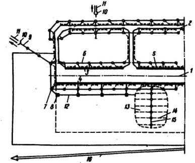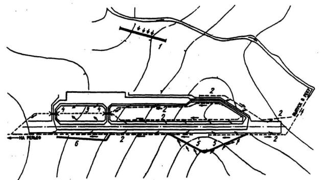 вид расположения водоотводных систем на аэродромах: Смотровые, тальвежные и водоприемные колодцы ВДС должны быть постоянно закрыты крышками. Открывать колодцы следует только при осмотре и ремонте ВДС. Земляные работы в зоне расположения элементов ВДС следует проводить только по специальным проектам. Весной дождеприемные и тальвежные колодцы следует освободить от крышек и щитов. После пропуска стоков следует провести внеочередной осмотр всей ВДС, отремонтировать и восстановить поврежденные элементы. Лотки, канавы, колодцы, оголовки коллекторов, перепуски следует очищать от наносов. СОДЕРЖАНИЕ ПЛОЩАДОК СПЕЦИАЛЬНОГО НАЗНАЧЕНИЯ, АЭРОДРОМНОГО ОБОРУДОВАНИЯ И УСТРОЙСТВ 5.1.76. Площадки специального назначения и сопряжения покрытий с грунтом следует содержать в исправном состоянии и своевременно очищать от пыли, грязи, снега и льда. Обработку ВС антиобледенительными средствами следует проводить на площадках с асфальтобетонным покрытием. Сброс неочищенных стоков с этих площадок в общую водоотводную систему запрещается. Места стоянки ВС, предназначенные для гонки двигателей (гоночные площадки), должны быть оборудованы специальными устройствами - якорными креплениями. 5.1.77. Якорные крепления. При безангарном хранении ВС на МС производят их крепление к якорным устройствам для предотвращения перемещения и повреждения ВС при воздействии ветровых нагрузок. В качестве якорных креплений для вертолетов используются швартовочные устройства, предназначенные для фиксации вертолета при гонке двигателей. Расчетные усилия на петли каждого якорного крепления приведены в табл. 5.3. Схемы расположения якорных устройств приведены в РТЭ ВС. Таблица 5.3 Расчетные усилия в растяжках якорных креплений ВС от воздействия ветровой нагрузки, кН/тс