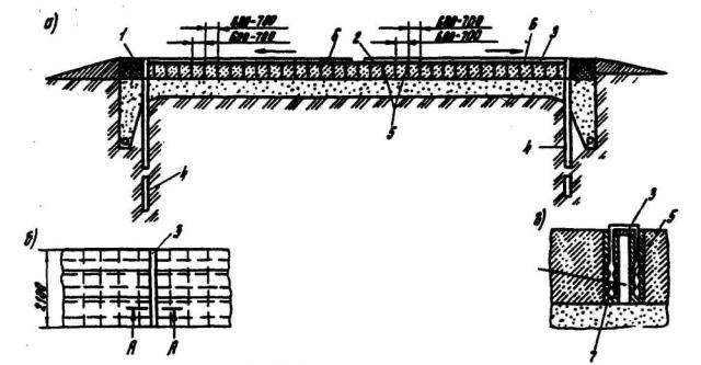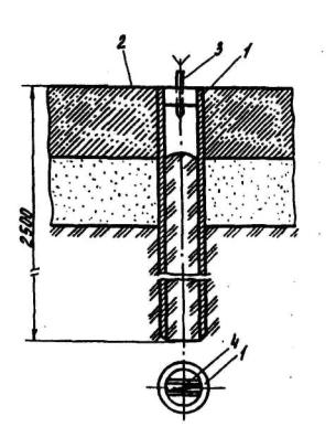 Примечания: 1. В числителе приведены: для самолетов - усилия в каждой растяжке крепления основных опор или крыльев, в знаменателе - передних опор или хвостовой части фюзеляжа; для вертолетов - суммарные усилия, приходящиеся на бортовой и носовой якори соответственно. 2. Тяжелые ВС, если это не оговорено в РТЭ применительно к особым условиям эксплуатации, при воздействии ветровых нагрузок не швартуются. 3. Расчетные нагрузки принятые коэффициентом безопасности 1,5 по отношению к максимальным эксплуатационным. 4. Расчетную скорость ветра принимают в соответствии с п.5.1.78 настоящего Руководства. 5.1.78. Расчетную скорость ветра для каждого аэродрома определяют по данным авиационной метеостанции за период не менее 25 лет или по карте "Районирование территории по скоростному напору ветра". Для аэродромов (вертодромов), расположенных на высоте 200 и более метров над уровнем моря, расчетную скорость ветра определяют только по данным местных станций гидрометеослужбы. 5.1.79. Якорные крепления сооружают по типовым проектам. На МС для самолетов 4-го класса и вертолетов 3-го класса, временных площадках допускается устройство якорных креплений упрощенного типа (горизонтально заглубленные в землю трубы, блоки, бревна, металлоконструкции и т.д.). Пример конструкции якорного крепления упрощенного типа приведен на рис. 5.2. 5.1.80. Заземляющие устройства предназначены для снятия заряда статического электричества с ВС и наземной техники. Заземляющие устройства устанавливают на местах стоянок и обслуживания ВС, на примыканиях РД к ИВПП. На примыканиях РД к ИВПП заземляющие устройства устанавливают стационарно путем закладки металлических элементов с анкерными креплениями в поперечные швы жестких покрытий или в специальные штрабы заподлицо с поверхностью покрытия (рис. 5.3.). Конструкция заземляющего устройства на МС и площадках обслуживания ВС приведена на рис. 5.4.