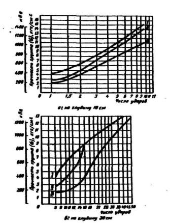 0,95 г/см3 и вязкостью Разжижителем может служить керосин, дизельное топливо и другие. 5.1.60. Рабочий состав маслобитумного вяжущего готовится следующим образом: жидкий битум подается насосом в цистерну автогудронатора до 1/3 его объема. После этого в таком же количестве подаются отработанные масла. Смесь перемешивается насосом автогудронатора, затем добавляется разжижитель в таком количестве, чтобы она достигла вязкости 30 - 50 с, причем вяжущее с меньшим значением вязкости применяется в дальнейшем при обработке супесчаных, а с большим - суглинистых грунтов. 5.1.61. Для обеспечения проникания маслобитумного вяжущего в грунт и равномерного его распределения рекомендуется производить измельчение поверхностного слоя, особенно суглинистых грунтов, на глубину не менее 10 см дорожной фрезой за 1 - 2 прохода или дисковыми, зубовыми боронами за 5 - 6 проходов по одному следу. После разлива вяжущего производится перемешивание обработанного грунта за 1 проход дорожной фрезой или за 2 - 3 прохода зубовыми или дисковыми боронами. Далее обработанный слой грунта уплотняется до величины 0,8 - 0,95 от стандартного уплотнения в зависимости от элемента летного поля 6 - 8 проходами пневмокатков, с последующим уплотнением гладкими катками 3 - 4 проходами по одному следу. При обработке несвязных грунтов методом пропитки толщина обрабатываемого слоя должна быть не менее 5 см. 5.1.62. Несущая способность грунтовых аэродромов повышается в среднем на 4 - 5 кгс/см2 при создании н сохранении дернового покрова. 5.1.63. Дернина должна удовлетворять следующим требованиям: иметь густоту травостоя и плотное сплетение корневищ на глубину не менее 12 - 18 см; обладать связностью, упругостью и устойчивостью к истиранию; иметь высоту травостоя не более 30 см, а после скашивания не менее 8 см. Качество дернового покрова определяется количеством побегов дернообразующих трав на единицу площади и предельной глубиной колеи, при которой он разрушается, в соответствии с данными табл. 5.2. Таблица 5.2