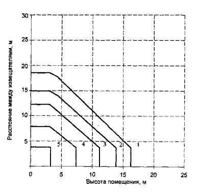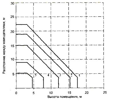 где RTI - индекс инерционности теплового извещателя, с·(м/с)0,5; τ - постоянная времени теплового извещателя, с; U - скорость газового потока, м·с-1; составляет 0,8 м·с-1. Максимальные пожарные извещатели малоэффективны для раннего обнаружения пожара и целей оповещения, если: - возможно развитие пожара с малым выделением тепла; - помещения неотапливаемые; - защищаемые помещения большой высоты и площади; - защищаются материальные ценности большой стоимости; - большая скорость развития пожара может привести к недопустимым материальным потерям к моменту его обнаружения, например, при горении легковоспламеняющихся и горючих жидкостей; - на поверхности чувствительных элементов извещателя может образовываться слой, ухудшающий параметры чувствительности извещателя; - ПИ устанавливаются на путях эвакуации (коридорах, холлах, фойе, залах). В помещениях, где возможна высокая скорость изменения температуры, не связанная с процессом горения, не рекомендуется устанавливать тепловые дифференциальные извещатели. Применение многоточечных (суммирующих) дифференциальных извещателей в ряде случаев более эффективно, чем точечных ПИ, так как они позволяют обнаружить очаг заданной тепловой мощности даже при большой высоте (сверх 9 м). Применение дифференциальных многоточечных извещателей и линейных тепловых извещателей в виде термокабеля должно производиться в соответствии с рекомендациями разработчика, согласованными с ведущими организациями в области пожарной безопасности. 11. Методика расчета максимально допустимых расстояний между точечными тепловыми и дымовыми пожарными извещателями11.1. Общие положения11.1.1. Предлагаемая методика позволяет рассчитывать максимально допустимые расстояния между точечными тепловыми и дымовыми пожарными извещателями в защищаемых помещениях в зависимости от следующих параметров: темпа развития возможного пожара; предельно допустимой тепловой мощности очага пожара к моменту его обнаружения; характеристик пожарных извещателей; высоты помещения; температуры воздуха в помещении до пожара. 11.1.2. Результаты расчета максимально допустимых расстояний между пожарными извещателями, не снижающие обязательных требований действующих норм, реализуются без согласования с органами Государственного пожарного надзора. Результаты расчетов, снижающие обязательные требования норм или не имеющие отражения в нормах, согласовываются с территориальными органами государственного пожарного надзора на основании экспериментальной проверки или экспертной оценки, проведенных головными организациями в области пожарной безопасности. 11.1.3. В качестве критерия своевременности обнаружения пожара в защищаемом помещении принимается условие срабатывания пожарных извещателей в момент достижения тепловой мощностью очага горения своего предельно допустимого значения, определяемого с учетом возложенной на автоматические установки пожарной сигнализации (АУПС) задачи (цели функционирования сигнализации) по обеспечению безопасности людей и/или материальных ценностей. 11.1.4. Положения настоящей методики не распространяются на: помещения, где применяются или хранятся пирофорные и взрывчатые вещества, вступающие в химическое взаимодействие с водой; технологические установки, расположенные вне зданий; помещения для хранени