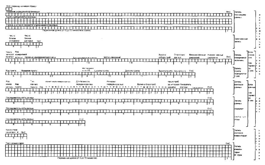 6.2.2.2 Классификаторы данных 6.2.2.2.1 Дрейф показаний Классификатор данных, устанавливающий, что данное является неверным между двумя калибровками средства измерений. Обозначают символом "D". 6.2.2.2.2 Режим калибровки Классификатор данных, устанавливающий, что средство измерений работает в режиме градуировки. Во время градуировки в средство измерений вводят поверочную газовую смесь. Обозначают символом "С". 6.2.2.2.3 Исправленное данное Классификатор данных, устанавливающий, что данное было исправлено. Обозначают символом "О". 6.2.2.2.4 Оцененное данное Классификатор данных, устанавливающий, что данное является оценкой, не существовало до проведения оценки, было ошибочным или недействительным. Обозначают символом "Е". 6.2.2.2.5 Ошибочное измерение Классификатор данных, устанавливающий сбой, обнаруженный при получении данных. Обозначают символом "F". 6.2.2.2.6 Недействительное данное Классификатор данных, устанавливающий, что данное является недействительным и его не следует учитывать. Обозначают символом "I". 6.2.2.2.7 Режим обслуживания Классификатор данных, устанавливающий, что данное было получено в период технического обслуживания средства измерений. Измерение является недействительным. Обозначают символом "М". 6.2.2.2.8 Отсутствие данного Классификатор данных, устанавливающий, что данное отсутствует. Поле с данными пустое. Обозначают символом "N". 6.2.2.2.9 Пригодное данное Классификатор данных, устанавливающий данное, пригодное к использованию. Обозначают символом "U". 6.2.2.2.10 Холостой режим Классификатор данных, устанавливающий, что был проведен холостой опыт или был использован нулевой газ, не содержащий определяемых загрязнителей. Обозначают символом "Z". 7 Содержание файлаОписание, полный формат обозначения полей с данными и число строк, содержащихся в записи, - в соответствии с таблицей 4. Структура файла приведена в приложении F. Пример файла с данными приведен в приложении G. Таблица 4 - Описание, формат и число строк в поле с данными