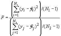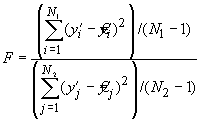 Проверяют, подтверждается или нет допущение относительно постоянства дисперсии для преобразованных переменных: - выбирают N1 пар результатов измерений в области верхней границы диапазона измерений и N2 пар в области нижней границы с условием N1 = N2 = N/3; - не используют среднюю часть диапазона; - статистику F вычисляют по формуле