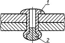 1 - головка «слепой» заклепки; 2 - «слепая» головка Рисунок 2 - «Слепая» заклепка с выступающей головкой 2.1.1.1.2 потайная головка «слепой» заклепки (countersunk blind rivet head): После установки заклепки верхняя часть головки оказывается практически заподлицо с поверхностью соединяемой детали (рисунок 3).