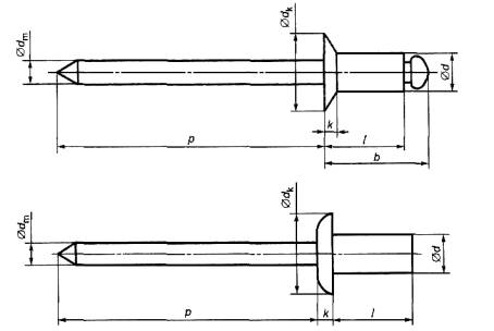 b - слепая длина; d - диаметр заклепки; dк - диаметр головки; dm - диаметр сердечника; к - высота головки; l - длина заклепки; р - выступающая длина сердечника Рисунок 17 2.6.1.1 длина заклепки (rivet length): Расстояние вдоль оси заклепки от внутренней стороны выступающей головки или от верхней поверхности потайной головки до конца заклепки. 2.6.1.2 слепая длина (blind length) (для заклепок с открытым концом): расстояние вдоль оси заклепки от внутренней стороны выступающей головки или от верхней поверхности потайной головки до конца головки сердечника. Примечание - Для заклепок с закрытым концом слепая длина равна длине заклепки. 2.6.1.3 выступающая длина сердечника (mandrel protrusion): Расстояние вдоль оси заклепки, на которое сердечник выступает из головки заклепки до установки. 2.6.2 Применение «слепых» заклепокНа рисунке 18 приведены размеры для применения «слепых» заклепок.