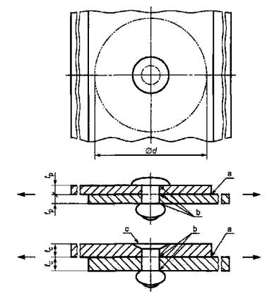 3.2.4 Подготовка испытательного пакета Две испытательные пластины/вставки, имеющие одинаковую номинальную толщину, должны быть соединены заклепкой, подлежащей испытанию. Заклепка должна быть установлена с помощью установочного инструмента и наконечника в соответствии с рекомендациями производителя заклепок. Общая толщина испытательного пакета не должна превышать максимальную толщину пакета, установленную для заклепки, подлежащей испытанию. 3.3 Процедура испытаний на срез и растяжение Испытательный пакет должен быть установлен в машину для испытаний на растяжение, соответствующую требованиям ИСО 7500-1. Захваты машины для испытаний на растяжение должны быть самоцентрирующиеся и должны гарантировать, что нагрузка приложена по прямой линии вдоль плоскости среза образца для испытания на срез или по прямой линии вдоль оси образца для испытания на растяжение. Нагрузку необходимо прикладывать непрерывно со скоростью не менее 7 мм/мин и не более 13 мм/мин до разрушения образца. Максимальная нагрузка регистрируется как предел прочности заклепки на срез или растяжение. В случае если заклепка повреждается при нагрузке менее установленных значений пределов прочности на срез или растяжение, то она не проходит испытание. 3.4 Испытания коротких заклепок Для заклепок с максимальной толщиной пакета меньше, чем
