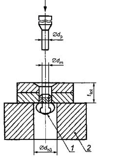 соответствовать размерам «слепой» головки, но диаметр 4.3 Процедура испытания способности головки сердечника удерживаться в корпусе заклепки Испытательный пакет должен быть установлен в машину для испытаний, соответствующую требованиям ИСО 7500-1 и оборудованную прессом, как показано на рисунке 6. Нагрузка должна прилагаться к необработанному концу сердечника непрерывно и без удара, строго вдоль оси сердечника, и действие нагрузки должно продолжаться до тех пор, пока сердечник не начнет двигаться относительно корпуса заклепки. Скорость испытания должна быть не менее 7 мм/мин и не более 13 мм/мин. Максимальная нагрузка до начала сдвига сердечника регистрируется как предел удерживания головки сердечника заклепки. 5 Испытание сопротивления выталкиванию сердечника (до установки)5.1 Принцип испытания сопротивления выталкиванию сердечника (до установки) Испытание состоит в приложении осевой нагрузки к сердечнику со стороны головки «слепой» заклепки до его выталкивания. Примечание - Это испытание не применимо к «слепым» заклепкам с закрытым концом и с забивным штифтом. 5.2 Приспособление для испытания сопротивления выталкиванию сердечника (до установки) (рисунок 7)