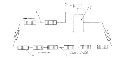 1 - расширительный бачок; 2 - трубопровод; 3 - генератор тепла; 4 - радиатор Черт. 1 Система с применением радиаторов (конвекторов)