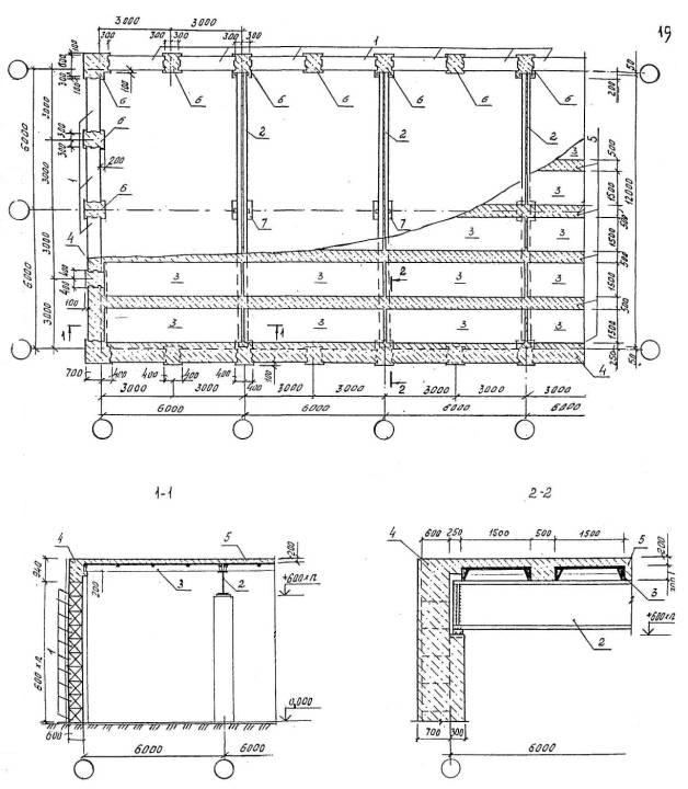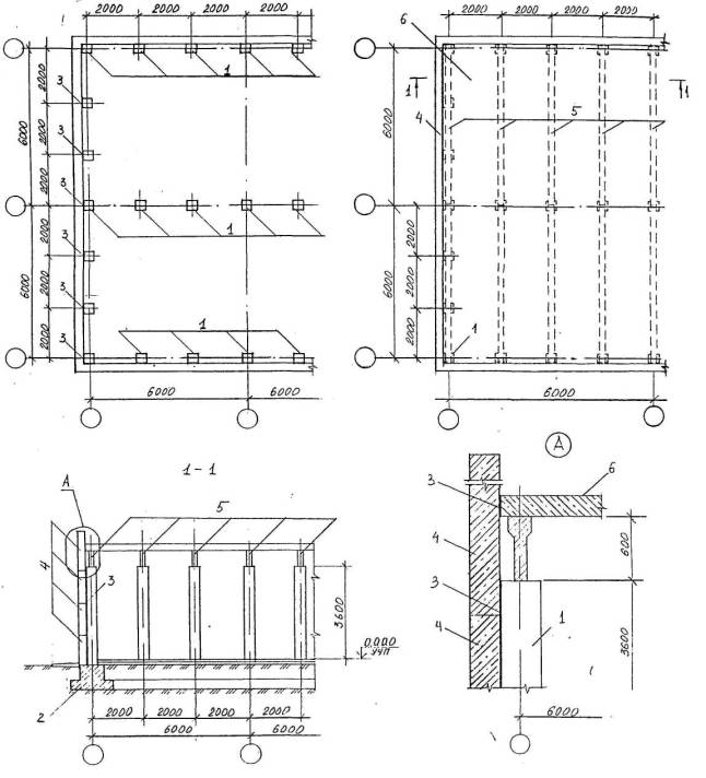Рис.1. Конструкция взрывобезопасного здания с использованием железобетонных элементов одноэтажных промышленных зданий пролетом 6 м. 1- ж.6. колонны; 2 - ленточные фундаменты под колонны; . 3 - прокладки из жесткой резины; 4 – стеновые панели ; 5 - стропильные балки; 6 - ж.б. монолитное покрытие.
