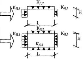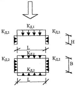 5.5. Расчёт конструкций зданий при внешних взрывах.5.5.1. Эквивалентные статические нагрузки от дефлаграционных взрывов ПГВС при расчёте по предельному состоянию 1а определяются с использованием коэффициентов, приведённых в табл. 47, где стрелками Þ показано направление распространения воздушной взрывной волны. Значения коэффициентов к величине избыточного давления во фронте взрывной волны. Таблица 47.