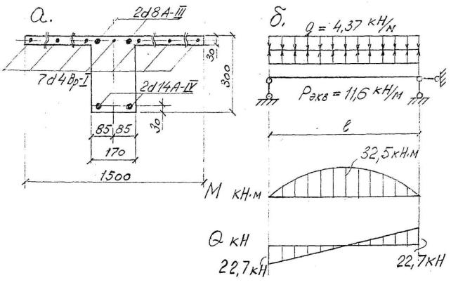 Стержень не разрушается, т.к. N = 15,0 < 303750 ´ 1,539 ´ 10-4 = 46,75 кН Монтажный сварной шов не разрушается, т.к. N = 15,0 < 180000 ´ 1,0 ´ 1,1 ´ 0,7 ´ (0,1 - 0,01) ´ 0,008 = 99,8 кН 6.5.5. Исходные данные для расчета плит покрытия: - плиты весом 1,4 т выполнены из бетона В15; - плиты крепятся к стропильным балкам 3-мя монтажными сварными швами, длиной 100 мм и высотой 8 мм каждый; - расчетная схема плиты и сечение приведены на рис. 17; - постоянная статическая нагрузка от собственного веса кровли равна (при ширине площадки загружения b = 1,5 м) q = l,2 ´ 1,5 = 1,8 кН/м Постоянная статическая нагрузка на плиту q = 1,8 + 14 ´ 1,1/6 = 4,37 кН/м По (32)