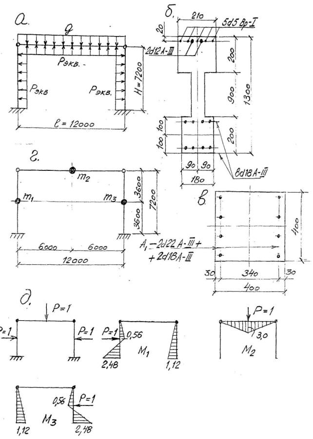 Т.к. Х = -0,028 м < 0, то принимаем X = 0, а условие прочности записываем относительно центра тяжести сжатой арматуры. Получим М £ Rsd ´ А ´ (ho - а1). Плита покрытия разрушается по нормальному сечению, т.к. М = 32,5 кН/м > (443750 ´ 1,01 ´ 10-4 + 405000 ´ 0,879 ´ 10-4) ´ (0,315 - 0,03) = 22,9 кН·м. Монтажные сварные швы, рассчитанные аналогично п. 6.5.4, не разрушаются. 6.5.7. Исходные данные для расчета поперечной рамы каркаса: - стропильные балки весом 4,1 т выполнены из бетона В30; - колонны каркаса весом 2,5 т каждая выполнены из бетона В15; - соединение балок с колоннами осуществляется посредством монтажных сварных швов, длиной 200 мм и высотой 8 мм каждый; - расчетная схема рамы и сечений приведены на рис. 18,а-в; - постоянная статическая нагрузка складывается из нагрузок от собственного веса кровли, плит покрытия и балки и равна (при ширине площадки загружения b = 6 м) q = 1,2 ´ 6 + 14,0 ´ 1,1/1,5 + 41,0 ´ 1,1/12 = 21,2 кН/м Динамическая расчетная схема рамы для определения частоты колебаний ωк приведена на рис. 18,г. Сосредоточенные массы m1, m2 и m3 равны (при определении m1 и m3 учитывалась присоединённая масса стеновых панелей, вес каждой из которых 21 кН)