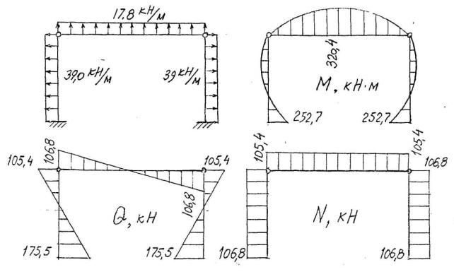 Рис.19. Эпюры М, Q, N в сечениях рамы.
