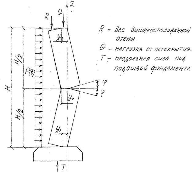 где е1 - эксцентриситет опорной реакции (расстояние от оси приложения опорной реакции перекрытия (покрытия) до центра тяжести сечения стены). При значении а > 1,172 максимальный момент будет в сечении примерно на уровне перекрытия, и несущие стены в этом случае могут быть рассчитаны статическим методом. Но поскольку в процессе действия динамической нагрузки величина эксцентриситета продольной силы меняется, не исключено, что максимальный момент при другом значении времени будет находится около середины стены (см. пример расчета в § 6.7.). 6.3.11. При необходимости φмакс (см. п.6.3.6.) - максимальный угол поворота блока, определяемый из решения дифференциального уравнения движения стены под действием внешних динамических нагрузок, составляет