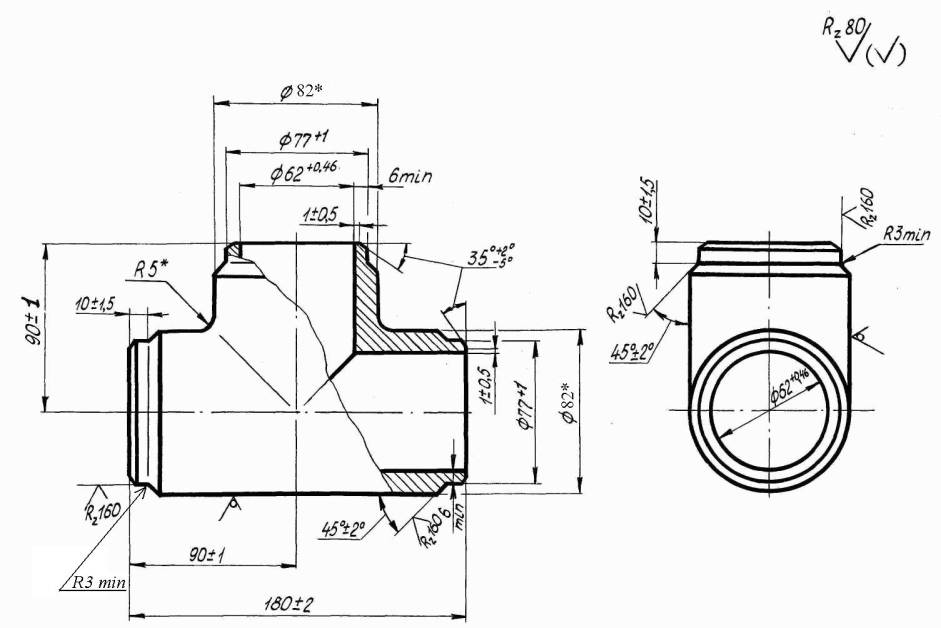 Указанием Министерства энергетического машиностроения от 04.06.82 № ВВ-002/4628 срок действия установлен с 01.01.85 до 01.01.96. Проверен в 1983 г(Измененная редакция, Изм. № 1, Изм. № 3, Изм. № 4). Несоблюдение стандарта преследуется по закону1. Настоящий стандарт распространяется на тройник равнопроходный штампованный с условным проходом 65 мм для паропроводов тепловых электростанций с абсолютным давлением Р = 9,81 МПа (100 кгс/см2), температурой t = 540°С. (Измененная редакция, Изм. № 3). 2. Конструкция и размеры тройника должны соответствовать указанным на чертеже. Масса тройника - 4,1 кг . (Измененная редакция, Изм. № 2). 3. Материал - сталь марки 12Х1МФ ТУ 14-1-3987-85 Гр.IIТ ОСТ 108.030.113-87. (Измененная редакция, Изм. № 4). 4. Остальные технические требования по ОСТ 108.030.113-87 и ОСТ 24.125.60-89. (Измененная редакция, Изм. № 3, Изм. № 4).