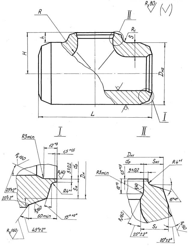 Указанием Министерства энергетического машиностроения от 04.06.82 № ВВ-002/4628 срок действия установлен с 01.01.85 до 01.01.96. Проверен в 1983 г (Измененная редакция, Изм. № 1, Изм. № 3, Изм. № 4). Несоблюдение стандарта преследуется по закону1. Настоящий стандарт распространяется на равнопроходные штампованные тройники с вытянутой горловиной для паропроводов тепловых электростанций с абсолютным давлением Р = 9,81 МПа (100 кгс/см2) и температурой пара t = 540°С. (Измененная редакция, Изм. № 3). 2. Конструкция, размеры и материал тройников должны соответствовать указанным на чертеже и в таблице. 3. Размеры высот Н и h , радиусов R и R1 и толщины стенки Sk1 могут быть изменены при соблюдении условий прочности по усмотрению изготовителя. 4. Предельные отклонения по наружному диаметру DH2 не должны превышать плюс 1,25% и минус 2%. 5. Остальные технические требования по ОСТ 24.125.60-89. (Измененная редакция, Изм. № 3, Изм. № 4). 6. Размер S1 обеспечивается технологией изготовления. (Измененная редакция, Изм. № 4).