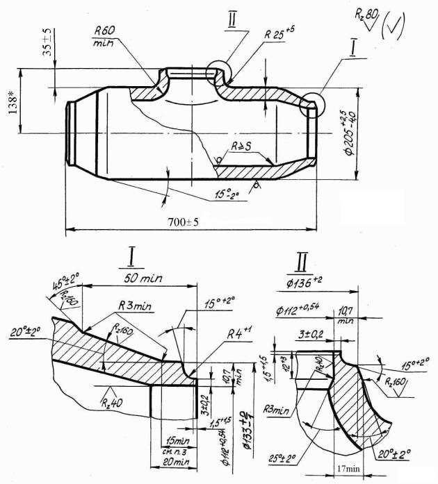 Указанием Министерства энергетического машиностроения от 04.06.82 № ВВ-002/4628 срок действия установлен с 01.01.85 до 01.01.96. Проверен в 1983 г (Измененная редакция, Изм. № 1, Изм. № 3, Изм. № 4). Несоблюдение стандарта преследуется по закону1. Настоящий стандарт распространяется на тройник равнопроходный штампованный с вытянутой горловиной и обжатыми концами для паропроводов тепловых электростанций с абсолютным давлением Р = 9,81 МПа (100 кгс/см2) и температурой t = 540°С. (Измененная редакция, Изм. № 3). 2. Конструкция и размеры тройника должны соответствовать указанным на чертеже. Масса - 112 кг (Измененная редакция, Изм. № 4). 3. Материал - сталь 15Х1М1Ф по ТУ 14-3-460-75. (Измененная редакция, Изм. № 2). 4. Размер прямого участка рекомендуемый и уточняется технологическим процессом изготовителя. Допускается изготовление подкатанной части без прямых участков. 5. Размеры высоты, радиусов R и R1 и толщины стенки горловины - могут быть изменены при соблюдении условий прочности по усмотрению изготовителя. 6. Остальные технические требования по ОСТ 24.125.60-89. (Измененная редакция, Изм. № 3, Изм. № 4). 7. Размер 17 min обеспечивается технологией изготовления. (Измененная редакция, Изм. № 4).