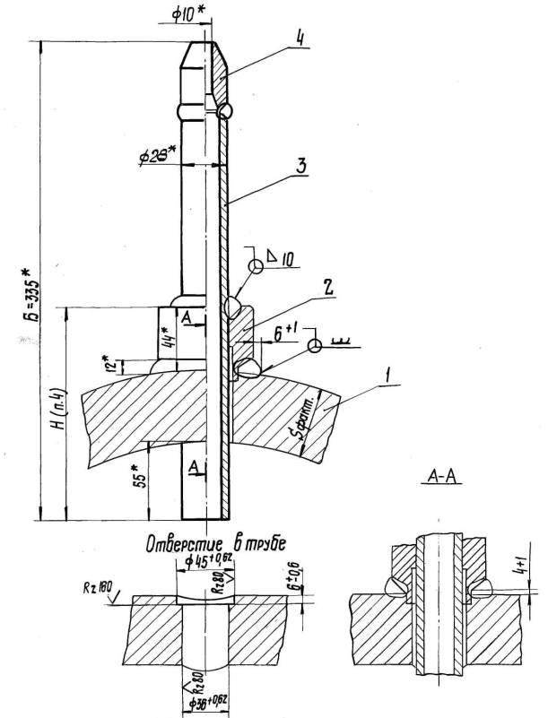 1 - труба; 2 - бобышка по ОСТ 108.462.32-79; 3 - патрубок по ОСТ 108.320.25-79; 4 - переход по 01ОСТ 108.318.18-82 (Измененная редакция, Изм. № 1).