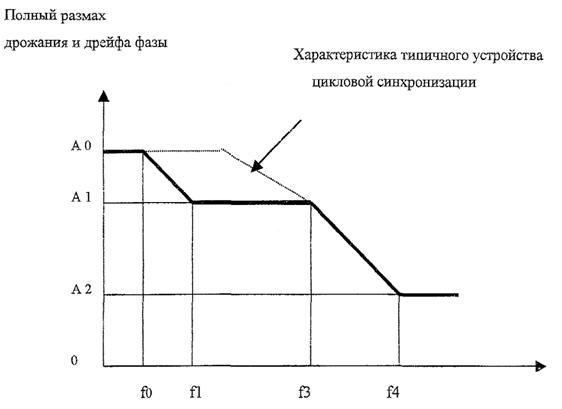 Рисунок 1 - Шаблон допустимых значений синусоидальных дрожаний и блужданий 4.4.6.2 Путем непрерывного контроля должны быть обнаружены в принимаемом ИКМ сигнале следующие аварийные сигналы: - сигнал извещения об аварии на удаленном конце (разряд РЗ канального интервала КИО цикла, не содержащего цикловой синхросигнал); - сигнал индикации аварии (СИА), представляющий собой непрерывную последовательность единиц во всех каналах, включая КИ0. Примечания 1 Аварийные сигналы должны обнаруживаться как при синхронном, так и плезиохронном режимах работы и коэффициенте ошибок не более 10ехр-3 - для СИА и не более 10ехр-4 - для сигналов извещения об аварии на удаленном конце. 2 Вероятность обнаружения аварийных сигналов за время 5 с должна быть более 0,95. 4.4.6.3 Должны быть предусмотрены технические средства обнаружения: - управляемых проскальзываний; - неуправляемых проскальзываний. Данные об управляемых и неуправляемых проскальзываниях должны передаваться в систему технической эксплуатации для последующей обработки. 4.4.6.4 В результате обработки аварийных сообщений должны обнаруживаться следующие аварийные состояния: - повышенная частота проскальзываний; - авария по частоте проскальзываний; - авария по частости аварийных сообщений, принимаемых с удаленного конца; - авария по частости нарушений цикловой синхронизации; - авария по частости отсутствия принимаемого из линии сигнала; - авария по частости появления сигнала индикации аварии; - авария по частости превышения коэффициента ошибок; - авария по частости сбоев в тактовых сигналах, поступающих от тактового генератора станции. 4.4.7 Структура сверхцикла (для сигнализации по выделенным сигнальным каналам в канальном интервале КИ16) 4.4.7.1 Число циклов в сверхцикле - 16. Нумерация циклов от 0 до 15 (Ц00-Ц15). 4.4.7.2 Номинальная длительность сверхцикла - 2 млс. 4.4.7.3 Вид сверхциклового синхросигнала - 0000. 4.4.7.4 Расположение сверхциклового синхросигнала - разряды с 1 по 4 канального интервала КИ16 цикла Ц0. 4.4.7.5 Разряд Рб канального интервала КИ16 цикла Ц0 должен использоваться для передачи на удаленный конец сигнала аварии в устройствах сигнализации, использующих канальный интервал КИ16. При этом авария передается единицей, отсутствие аварии - нулем. 4.4.7.6 В разрядах Р5, Р7 и Р8 КИ16 цикла Ц0 передаются единицы. 4.4.7.7 Каждый канальный интервал КИ16 в циклах с Ц1 по Ц15 используется для передачи информации сигнализации двух каналов связи. 4.4.7.8 Неиспользуемые разряды Р3 и Р4 должны заполняться нулями, а разряды Р4 и Р8 - единицами. 4.4.8 Сверхцикловая синхронизация и контроль 4.4.8.1 Выход из сверхцикловой синхронизации имеет место при наличии ошибок в двух последовательных сверхцикловых синхросигналах. 4.4.8.2 Вхождение в синхронизм по сверхциклу должно обеспечиваться после правильного приема одного сверхциклового синхросигнала. 4.4.8.3 При использовании синхронизации по сверхциклу путем непрерывного контроля должно быть предусмотрено обнаружение следующих неисправностей: - неисправность источника электропитания; - отсутствие принимаемого сигнала 64 кбит/с; - нарушение сверхцикловой синхронизации. 4.4.8.4 Должно быть предусмотрено обнаружение сигнала аварии с удаленного конца (разряд Р6 интервала КИ16 цикла Ц0). Примечания 1 Аварийный сигнал должен обнаруживаться, как в режиме синхронной работы, так и в режиме плезиохронной работы пр