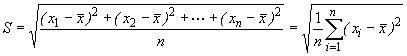 где: xi - отдельные x1, x2,…xn, измеренные значения анализируемого параметра i, n - объем выборки. Выборочное среднее квадратическое отклонение S определяется: