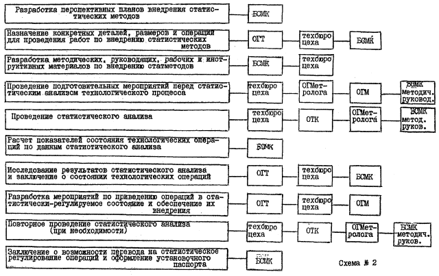вычисляются статистические характеристики (Пример приведен в приложении 3). В приложении 4 приведены итоговые данные по анализу точности и стабильности основных видов технологических процессов: механической обработки (табл.1), штамповки (табл.2) прессования пластмасс (табл.3), где уровень дефектности определен по вышеуказанной номограмме. Полученные результаты статистического анализа позволяют дать аргументированную оценку состояния технологических процессов и предложить рекомендации по их усовершенствованию. Особую значимость при статистическом анализе технологического процесса приобретает взаимодействие служб предприятия, учитывая необходимость достоверности получаемой информации для принятия управленческих решений. 5. Взаимодействие основных служб и функциональные обязанности должностных лиц при проведении статистического анализа5.1. Подразделение статистического контроля и отдела главного технолога является методическим центром на предприятии по исследованию и внедрению в производство статистических методов анализа точности и стабильности технологических процессов. 5.2. Надзор и информация за состоянием статистических методов возлагается на контрольный аппарат ОТК, в составе которого имеется инспекторская группа, осуществляющая инспекторский контроль за соблюдение правил статистических методов. 5.3. В организации и проведении статистического анализа точности и стабильности оборудования должны принимать участие все основные службы предприятия и, прежде всего, отдел главного технолога, отдел технического контроля; главного механика, руководители цехов и участков, а также отделы подготовки кадров, труда и зарплаты. Одним из важнейших практических вопросов организации внедрения статистических методов на предприятии является определение роли каждого подразделения. На нижеприведенной схеме 1 дана функциональная взаимосвязь подразделений, занимающихся статистическими методами убавления качеством продукции на предприятии. Схема № 1 Последовательность проведения работ по статистическим методам и основные подразделения-исполнители представлены на схеме № 2. 5.4. Обязанности должностных лиц и исполнителей 5.4.1. Начальник цеха: обеспечивает выполнение пунктов плана оргтехмероприятий, направленных на приведение технологических процессов в статистически регулируемое состояние; создает в цехе условия для внедрения и ведения статистического анализа и регулирования. Наглядно показывает достижения отдельных исполнителей; несет ответственность за поддержание технологических процессов и оборудования в стабильном состоянии. 5.4.2. Производственный мастер цеха: принимает участие в оценке точности и стабильности технологических процессов и разработке мероприятий по их отладке; совместно с контрольным мастером и технологом цеха организует внедрение статистических методов; в течение смены периодически следит за состоянием статистических методов в цехе и в случае нарушений немедленно принимает меры по их устранению; в конце смены визирует контрольные карты и анализирует их совместно с технологом цеха; совместно с начальником БТК несет ответственность за соблюдение правил статистического анализа и регулирования технологических процессов на своем участке. 5.4.3. Начальник техбюро цеха: обеспеч
