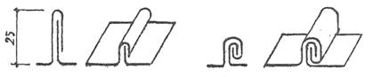 (оцинкованные или окрашенные кузбасслаком) длиной Настенные желоба должны иметь высоту от 120 до Листы желобов соединяют между собой двойными лежачими фальцами, которые уплотняют герметиком или замазкой. Верхние кромки желобов заканчивают отворотной лентой и дутой губкой, Настенные желоба должны иметь уклоны, в зависимости от расстояния между трубами и площади водосбора, от 1:10 до 1:20. Крючья для устройства настенных желобов длиной Лотки настенных желобов должны иметь уклон не менее 4° и ширину 10,5- Рядовое покрытие кровель при уклоне свыше 16° устраивают из картин, соединяемых одинарными фальцами. При уклонах меньше 16° соединение выполняют двойным фальцем с уплотнением их замазкой иди герметиком. Вдоль скатов кровли фальцы выполняют стоячими, а поперек (параллельно коньку) лежачими. Лежачие фальцы располагают непосредственно на обрешетке. Горизонтальные фальцы соседних листов смещают один относительно другого не менее чем на Картины из листовой стали крепят к обрешетке кляммерами, один конец которых прибивают к боковой стороне бруска обрешетки, а второй заводят в фальц соединяемых между собой листов кровли. Разжелобки кровель покрывают заранее заготовленными изогнутыми ендовами. Ендовы выгибают посередине разжелобка и соединяют между собой вдоль ската и с рядовым покрытием двойными лежачими фальцами. Устройство и навешивание водосточных труб выполняется строго по ГОСТу 7625-86. Обечайку трубы соединяют с лотками настенных желобов заклепками. Вертикальные швы труб выполняют двойным фальцем шириной
