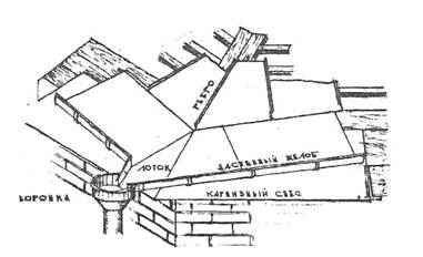 вверху Лист цинка у свеса заканчивается выдающимся вперед валиком, играющим роль отлива. Валик прикрепляют усиленными кляммерами: передняя поверхность колпака перекрывает валик (рис. 3). Свес может быть перекрыт