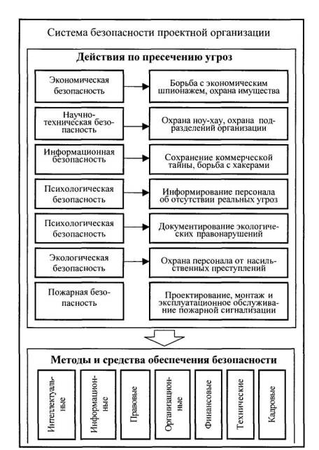 Рис. 1. Система безопасности проектной организации Соответственно, можно говорить и о применяемых методах и средствах обеспечения безопасности проектной организации: Интеллектуальные методы и средства. Патентование, оформление авторских прав, ноу-хау и т.д. Привлечение к работе высококлассных специалистов, научных работников (иногда целесообразно привлекать их со стороны), что позволяет внедрять новые системы безопасности. Информационные методы и средства. Составление характеристик на сотрудников, аналитические материалы и учет конфиденциального характера и т.д. Прежде всего, это печатная и видео-продукция по вопросам сохранения конфиденциальной информации. Кроме этого, важнейшая информация для принятия решений по вопросам безопасности сохраняется в компьютерах. Правовые методы и средства. Судебная защита законных прав и интересов, содействие правоохранительным органам и т.д. Имеется в виду использование не только изданных вышестоящими органами власти законов и подзаконных актов, но также разработка собственных, локальных правовых актов по вопросам обеспечения безопасности. Организационные методы и средства. Создание зон и постов безопасности, режим, расследование и т.д. Создание специализированных структурных подразделений, обеспечивающих безопасность проектной организации. Финансовые методы и средства. Материальное стимулирование сотрудников, имеющих достижения в обеспечении безопасности, денежное поощрение информаторов и т.д. Совершенно очевидно, что без достаточных финансовых средств невозможно функционирование системы безопасности, вопрос лишь в том, чтобы использовать их целенаправленно и с высокой отдачей. Технические методы и средства. Наблюдение, контроль, идентификация и т.д. К ним относятся охранно-пожарные системы, видео-радиоаппаратура, средства обнаружения взрывных устройств, бронежилеты, заграждения и т.д. Кадровые методы и средства. Подбор, расстановка и обучение кадров, обеспечивающих безопасность проектной организации и т.д. Имеется в виду прежде всего достаточность кадров, занимающихся вопросами обеспечения безопасности. Одновременно с этим решают задачи повышения их профессионального мастерства в этой сфере деятельности. Действия по пресечению угроз, а также методы и средства обеспечения безопасности приведены на рис. 2. Применение каждого из вышеуказанных средств в отдельности не дает необходимого эффекта, он возможен только на комплексной основе. Переведенные из статичного в динамичное состояние вышеуказанные средства становятся методами, т.е. приемами, способами действия. Совокупное использование методов решения соответствующих задач и средств обеспечения безопасности проектной организации позволяет создать в организации эффективную систему безопасности. Защита интеллектуальной собственности проектной организации является одной из основных задач, обеспечивающих высокий уровень потенциала проектной организации, ее конкурентоспособность, эффективное функционирование и развитие организации в современных условиях. Поэтому при рассмотрении вопросов функционирования системы безопасности проектной организации особое внимание уделяется именно вопросам защиты интеллектуальной собственности организации. При этом имеется в виду, что защита интеллектуальной с