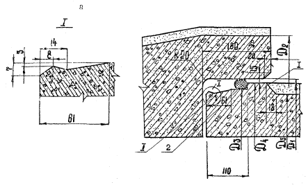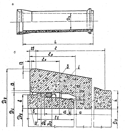 железобетонная напорная центрифугированная (ГОСТ 16953-78): а - общий вид, б - деталь стыкового соединения: Основные размеры железобетонных виброгидропрессованных труб со стальным цилиндром (ТУ 33-10-84) приведены в табл. 4 и на рис. 3. Основные размеры железобетонной центробежно-прокатной трубы ТРНЦ 2,5-1 (ТУ 33-22-83) приведены на рис. 4. 2. Железобетонные трубы поставляются в комплекте с резиновыми уплотнительными кольцами ТУ (38-105.1092-77 и ТУ 38-Т05. 1222-81) рис.5. Размеры резиновых колец приведены в табл. 5. 3. Пригодность трубы для работы на проектном давления определяют по заводской маркировке ОТК и характеристике трубы, нанесенной несмываемой краской на поверхность трубы. 4. При получении партии труб с завода-изготовителя необходимо осуществлять их выборочный осмотр с целью выявления возможных дефектов. 5. Если в процессе осмотра возникнут сомнения в отношении прочности труб, а также в случае разрушения труб или потере герметичности первого участка трубопровода при предварительном его испытании, рекомендуется подвергать данную партию труб выборочному испытанию на стенде на величину испытательного давления. 6. По окончании осмотра полученной партии труб и резиновых уплотнительных колец, проверки их размеров, а также предварительного испытания труб на стенде, на все дефектные трубы и резиновые уплотнительные кольца должны быть своевременно оформлены акты и предъявлена рекламация заводу-изготовителю в установленном порядке. Таблица 4