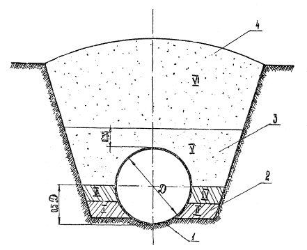 Примечание: Конструктивное описание клещевого захвата конструкции ВНИИЗеммаш (МВ-16) приведено в приложении 3. 7. При разгрузке и погрузке железобетонных труб запрещается сбрасывать их с автотранспорта, ударять друг о друга и о борта автомобиля, пропускать канат через полость трубы, а также цеплять крюки за концы труб и перемещать трубы по земле волоком. 8. При раскладке вдоль трассы трубы укладывают на спланированную поверхность. Для удобства захвата и сохранности раструбной части, трубы укладывают на деревянные подкладки. Высоту подкладок следует принимать такой, чтобы исключить возможность опирания раструба на землю. Подкладки устанавливают на расстоянии 1 м от торцов труб. 9. Резиновые уплотнительные кольца перевозят в мешках или ящиках, куда их складывают пачками или связками. 10. Кольца должны быть защищены от попадания на них масел и растворителей (бензина, бензола и др.), а также от прямых солнечных лучей. 6. ЗЕМЛЯНЫЕ РАБОТЫ1. В состав земляных работ при строительстве линейной части напорных трубопроводов входят: отрывка траншеи, подготовка основания под трубы, обратная засыпка трубопровода. 2. При производстве земляных работ необходимо предусматривать мероприятия, обеспечивающие сохранность растительного слоя почвы. 3. Размеры и профиль траншеи устанавливают проектом в зависимости от вида труб, их диаметра и гидрогеологических условий в соответствии с требованиями СНиП III-8-76 "Земляные, сооружения". 4. Ширину траншеи по дну необходимо увязывать с габаритами рабочего органа землеройных машин, механизмов, производящих стыковку труб и возможностью проведения наиболее качественного уплотнения грунта обратной засыпки в "пазухах". 5. Разработку протяженных траншей предпочтительнее вести экскаваторами непрерывного действия. 6. Использование одноковшовых экскаваторов следует рассматривать, как исключение и применять лишь там, где работа экскаватора непрерывного действия невозможна: на участках горизонтальных и вертикальных углов поворота; на переходах через все виды искусственных и естественных препятствий; в грунтах с крупными включениями, обводненных сыпучепесчаных и разрыхленных скальных; в случаях, когда экскаваторы непрерывного действия не имеют возможности разрабатывать траншею заданных параметров. 7. Выбор метода разработки траншеи и вида землеройной техники зависит от параметров траншеи, характера местности, категории грунта, гидрогеологических условий и наличия средств механизации в строительных организациях 8. Отвал вынутого минерального грунта располагают с одной стороны траншеи, оставляя противоположную сторону свободной для прохода механизмов и размещения труб. При рельефе местности с выраженным уклоном, отвал следует располагать с нагорной стороны траншеи. Такое расположение отвала поможет предотвратить попадание ливневых вод в траншею. 9. Если проектом не предусмотрено устройство искусственного основания, то железобетонные трубы укладывают на естественный грунт ненарушенной структуры. 10. Устройство естественного основания ненарушенной структуры возможно в любых грунтах за исключением болотисто-торфяных, разжиженных (плывунов) и скальных. 11. Отдельные камни, валуны и другие крупные включения должно быть из основания удалены, а образовавшиеся углубления закопаны пригодным местным или