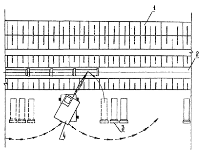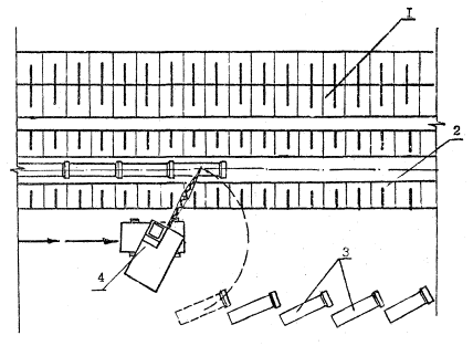 где В - ширина траншеи по дну; С - ширина ходовой части крана или расстояние между наружными краями опор крана; а - допустимое расстояние от подошвы откоса траншеи до ближайшей опоры крана (см.п.3.8 СНиП III-4-80 "Техника безопасности в строительстве"). При невозможности соблюдения этого равенства стенки траншеи должны быть укреплены. 6. Раскладку труб в трассовых условиях осуществляют либо по параллельной схеме (трубы раскладывают параллельно траншее в таком порядке, в каком они должны быть уложены), либо по поперечной схеме - перпендикулярно оси траншеи. 7. При расположении крана у бровки траншеи, трубы раскладывают либо за краном, либо, если ширина монтажной площадки ограничена, вдоль бровки траншеи. Однако в этом случае кран сможет подойти к трубам только с одной стороны, что значительно ограничивает возможность его маневра. Схема монтажа трубопровода показана на рис. 7. 8. Строповка труб осуществляется при помощи грузозахватных приспособлений, марки и краткие технические характеристики которых даны в разделе 5 настоящего пособия. 9. Подготовка железобетонных труб (ТУ 33-10-84 и ТУ 33-22-83) к стыковке, имеющих на втулочной части канавку, заключается в следующем: в канавку втулочной частя трубы устанавливают резиновое кольцо, при этом необходимо проконтролировать, чтобы кольцо легло в канавку равномерно, без перекручивания. Для облегчения стыковки внутреннюю поверхность раструба, ранее уложенной трубы и наружную поверхность резинового кольца, одетого на втулочную часть монтируемой трубы, смазать мыльным раствором или графитно-глицериновой смазкой. 10. Подготовка к стыковке железобетонных труб с гладкой втулочной частью (ГОСТ 12586.0-83 и ГОСТ 16953-78) заключается в следующем: на втулочный конец трубы одевают резиновое кольцо, при этом необходимо, чтобы наружная поверхность втулочного конца трубы была сухой и чистой, в противном случае ее протирают сухой тряпкой и высушивают сухим цементом или мелом в порошке. Начальное положение резинового кольца следует считать правильным, если оно расположено без перекручивания по всей своей окружности. Для облегчения стыковки наружную поверхность резинового кольца припудривают сухим цементом или мелом в порошке, т.к. в этом случае при стыковке будет происходить закатывание резинового кольца в раструбную щель. 11. Стыковку железобетонных труб большого диаметра производят машиной для монтажа МВ-15, с помощью центратора МВ-17 конструкции ВНИИЗеммаш и УкрНИИГиМ. Краткие технические характеристики и принцип их работы приведены в приложениях 1 и 2. Схема стыковки железобетонных труб с помощью машины для монтажа трубопроводов МВ-15 показана на рис. 8. 12. Расстроповку трубы производят только после проверки правильности ее укладки и подбивки пазух. 13. Применение всякого рода подкладок для выравнивания трубы запрещается. 14. Раструбную щель состыкованных труб заделывают цементно-песчаным раствором. Во избежание разрушения цементно-песчаного замка, заделку раструбных стыков необходимо производить с отставанием на 3…4 трубы. 15. В процессе монтажа трубопровода необходимо следить за тем, чтобы внутренняя поверхность труб не загрязнялась и внутри трубопровода не оставались посторонние предметы. 16. При перерывах в работе концы уложенного трубопровода следует закрывать заглушками.