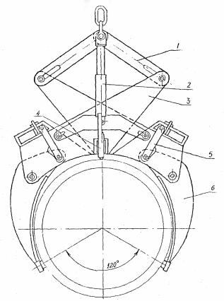 Захват предназначен для механизации работ по строповке и расстроповке труб, подачи их в траншею и укладки. Навешивается захват на крюк крана грузоподъёмностью 25...50 т. Схема захвата приведена на рис.11.