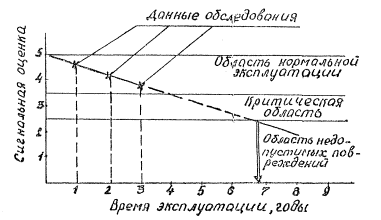 где Ni - количество плит, имеющих повреждения i -го вида; N0 - общее количество плит на обследованном участке аэродрома. По результатам обследований аэродромов с использованием метода экспертных оценок установлены следующие значения коэффициентов весомости: 0,1; 0,05 и 0,03 соответственно для наиболее распространенных видов повреждений: околы кромок, сквозные трещины, шелушение поверхности. Как видно, наибольшее отрицательное влияние на эксплуатационные свойства покрытия оказывают повреждения в виде сколов кромок плит. Значение показателя D0 позволяет вычислить сигнальную оценку К эксплуатационно-технического состояния покрытия с использованием следующего выражения: К = Кмакс - D0, (3) где Кмакс - наивысший показатель сигнальной оценки, по пятибалльной системе оценок Кмакс = 5. Для практического использования можно рекомендовать по результатам обследования строить график зависимости значений сигнальной оценки от времен эксплуатации покрытия (см. рисунок).