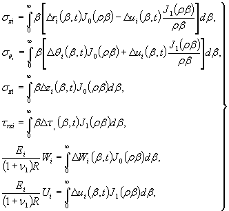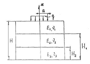 Рис.2. Расчетная схема для трехслойной плиты Для решения поставленной задачи воспользуемся математическим аппаратом, разработанным в работе [1] для расчета слоистой плиты, лежащей на упругом полупространстве. Напряжения и перемещения в i-м слое (i = 1, 2, 3) плиты выражаются через несобственные интегралы следующего вида: где Ei, νi- модуль упругости и коэффициент Пуассона i-го слоя плиты (меняется от 1 до 3); J0(ρβ), J1(ρβ) - функция Бесселя первого рода нулевого и первого порядков;