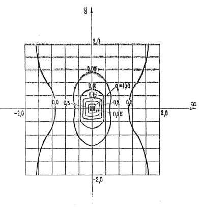 В полученных; выражениях (5) и (6) выделены слагаемые, соответствующие прогибу и изгибающему моменту в бесконечной плите, а остальные слагаемые представляют собой обобщенные; решения дифференциального уравнения (1). На основе полученного решения разработан алгоритм и программа расчета для ЭВМ типа ЕС. В качестве примера рассмотрим изгиб прямоугольной плиты (рис.1) с приведенными размерами 4,0 х 4,0 оо свободным контуром, лежащей на упругом основании Винклера, с нагрузкой в центре, равномерно распределенной по площадке размером 0,1 × 0,1, и интенсивностью q = 100.