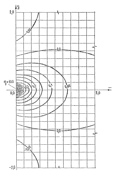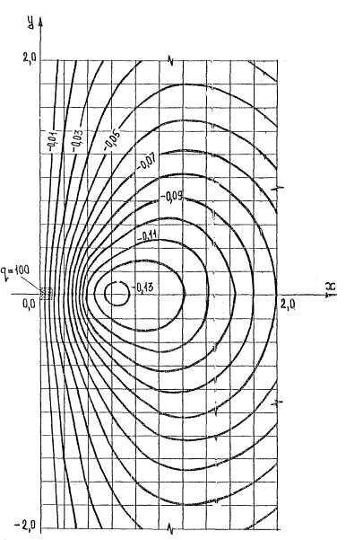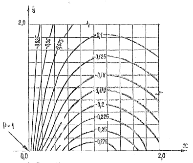 Рис.4. Распределение изгибающего момента Мх в четвертьбесконечной плите, загруженной в углу сoсpeдоточенной силой Р = 1.