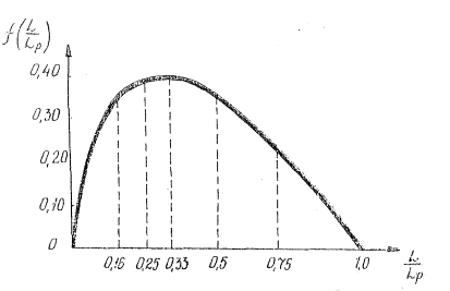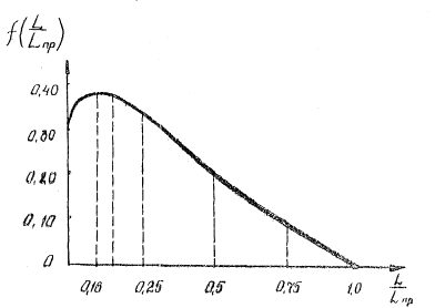 Построенная по данному закону кривая распределения (рис.1) наглядно показывает, что в этом случае экстремальные воздействия от динамической нагрузка приходятся на 1/3 длины дистанции разбега самолета.