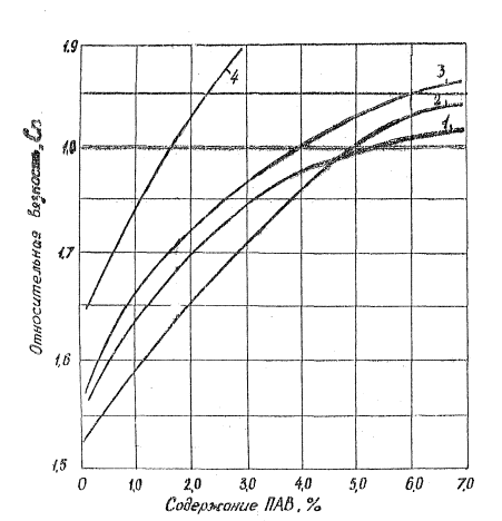 Рис.1. Зависимость относительной вязкости 30 %-ного раствора реагента НКМ от содержания ПАВ: 1 - ОП-7; 2 - синтанол ДС-10; 3 - синтамид-5; 4 - судьфонол