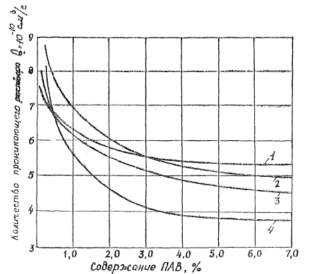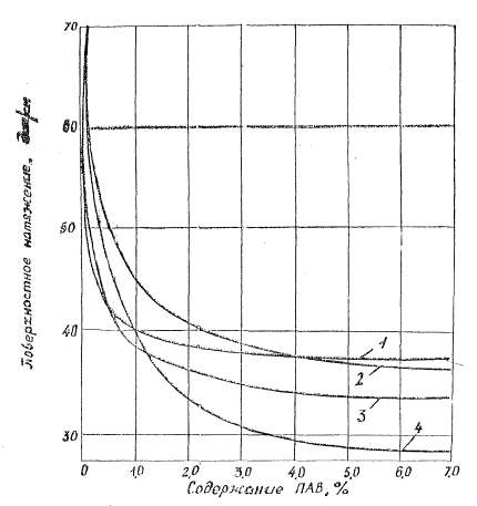 Рис.2. Зависимость поверхностного натяжения 30%-ного раствора реагента НКМ от содержания ПАВ: 1 - ОП-7; 2 - синтамид-5; 3 - синтанол ДС-10; 4 - сульфонол Замена ОП-7 в реагенте AHС на рекомендуемые ПАВ также снижает (в 1,5 - 1,35 раза) проникающую способность растворов.