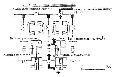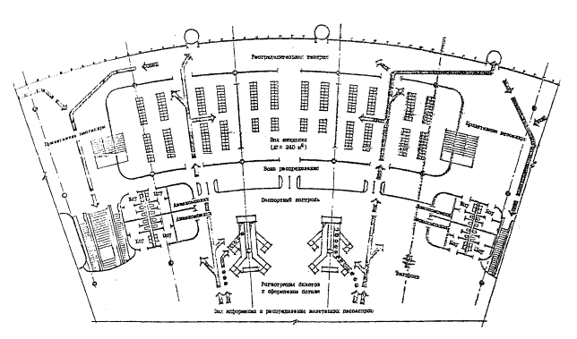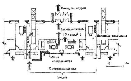 ВР - ширина рампы, м; В - ширина склада, м; Коз - коэффициент, учитывающий озеленение и благоустройство территории грузового комплекса (для первой группы грузового комплекса - 1,20, для второй группы - 1,16, для третьей группы - 1,12); Кр - коэффициент, учитывающий режимно-охранное обеспечение (для первой группы грузового комплекса - 1,15, для второй группы - 1,10, для третьей группы - 1,06). Предлагаемая методика позволит при проектировании облегчить расчеты и с достаточной точностью определять общую площадь грузового двора и отдельных его зон. Канд. архитектуры М.Г. Писков 10. ПЛАНИРОВОЧНЫЕ РЕШЕНИЯ ЗАЛОВ-НАКОПИТЕЛЕЙ В АЭРОВОКЗАЛАХ ДЕЦЕНТРАЛИЗОВАННОГО ТИПААнализ развития аэровокзалостроения выявил естественный процесс развития залов-накопителей в централизованных аэровокзалах в самостоятельный модуль аэровокзала децентрализованного типа, который может быть решен в одном или двух уровнях в зависимости от типа аэровокзала - с применением или без применения телескопических трапов. При решении в одном уровне зона обслуживания пассажиров и помещение обработки багажа блокируются по горизонтали, а при решении в двух уровнях - по вертикали. В малых аэровокзалах, а также при ограниченных ассигнованиях на строительство при отсутствии возможности применения или нецелесообразности применения телескопических трапов наиболее рациональным и приемлемым можно считать решение в одном уровне. При проектировании аэровокзала обычно необходимо определить вместимость и основные параметры модуля. В качестве примера определения параметра модуля можно рассмотреть аэровокзал в новом аэропорту Казань-2, для которого разработан модуль, рассчитанный на единовременное обслуживание одного рейса с максимальным количеством пассажиров 100 чел. (рис.1). Один модуль может обслуживать самолеты типа Ту-134. Для обслуживания самолета Ту-154 на 158 мест предусмотрено блокирование двух модулей с целью сокращения времени оформления рейса до 30 - 40 мин за счет удвоения площади, персонала и оборудования. Применение одного унифицированного модуля, рассчитанного на обслуживание различных типов самолетов от 50 до 150 мест, представляется не более целесообразным. При разработке модуля для каждого типа самолета может получиться недостаточно гибкая планировочная структура, при которой использование большого модуля для самолета малой вместимости будет слишком нерационально, а использование малого модуля для самолета большой вместимости практически невозможно.