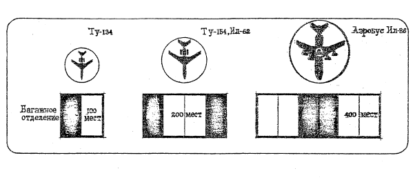 Рис.2. Принцип использования модулей при различной пассажировместимости самолетов В модуле может быть использовано как простейшее оборудование в виде прилавков, диспетчерских стоек и контрольных весов при упрощенном порядке регистрации билетов и оформления багажа, так и более сложное оборудование с применением автоматических весов, сблокированных с ленточными транспортерами при порейсовом методе регистрации. Решения в двух уровнях характерны для аэровокзалов, в которых применяются телескопические трапы для посадки пассажиров в самолет. В первом уровне, как правило, производится обслуживание прилетевших пассажиров, во втором - регистрация билетов и оформление багажа вылетающих пассажиров (рис.3).