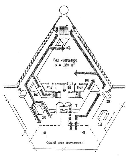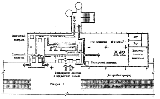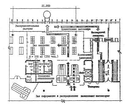 Рис.8. Планировочное решение зала-накопителя (модуля) в аэровокзале Лион-Сатолас Залы-накопители являются важнейшими функциональными узлами аэровокзалов. Поэтому при разработке новых Норм технологического проектирования аэровокзалов следует уделить особое внимание вопросам вместимости площадей планировочных решений залов-накопителей. При внедрении в эксплуатацию самолетов повышенной вместимости типа Боинг-747 Международная ассоциация воздушного транспорта ИАТА предложила авиакомпаниям рекомендации для расчета площади залов-накопитедей, которые могут быть использованы при определении планировочных параметров модуля. Эти рекомендации основаны на следующих положениях: - коммерческая загрузка самолета наибольшей вместимости, обслуживаемого аэровокзальным комплексом, составляет 80 %. - количество сидящих и стоящих пассажиров принимается по 50 % от вместимости самолета с учетом коммерческой загрузки. Удельные показатели площадей составляют: 1м2 - для одного стоящего пассажира, 1,5 м2 - для одного сидящего пассажира. Площадь для проходов и служебной зоны авиакомпаний составляет 10 % от определенной выше общей площади. В качестве примера определение площади зоны ожидания модуля можно привести простой расчет параметров зала-накопителя для самолета на 400 мест (по рекомендации ИАТА): - вместимость самолета - 400 пассажиров; - 80 % коммерческой загрузки - 320 пассажиров; - площадь для 160 стоящих пассажиров, исходя из условия 1м2 на человека - 160 м2; - площадь для 160 сидящих пассажиров, исходя из условия 1,5 м2 на человека - 240 м2; - площадь для проходов и служебной зоны (дополнительные 10 % от 400 м2) - 40 м2; - общая требуемая площадь - 440 м2.